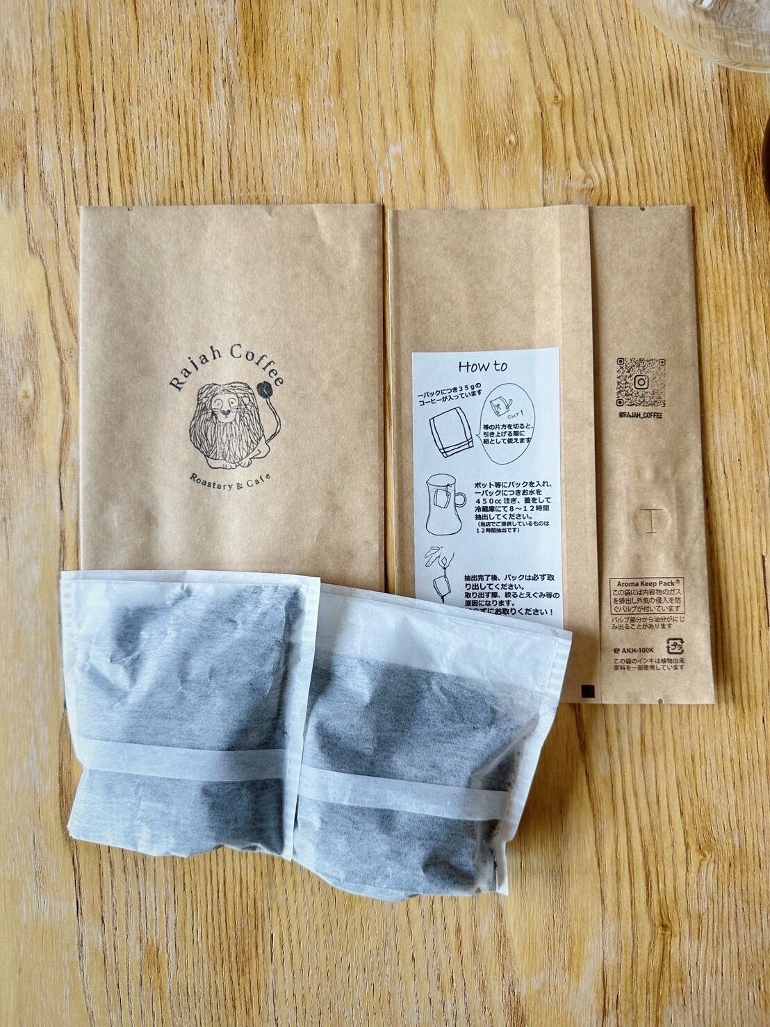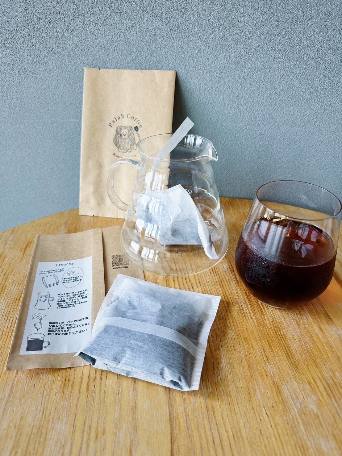 ・抽出方法:パックを切らずにそのままガラスポットに入れ、水を注ぎ、冷蔵庫で8~12時間冷やしてください。完成後に粉パックを取り出してください。パックを絞るとえぐみが出てくるので、取り出し時は、絞らずに静かに取り出してください。